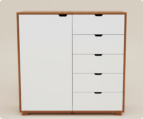 Armario o cómoda de alto diseño moderno y funcional , que combina dos tipos de almacenamiento en una sola pieza, ideal para un dormitorio o vestidor. Está enmarcado por una estructura de madera con un tono cálido y rojizo , que contrasta sutilmente con los frentes de los cajones y la puerta en un color rosa pálido o salmón muy suave , lo que le confiere una estética delicada y contemporánea.