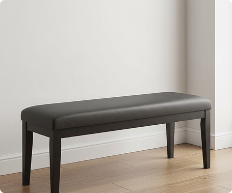 Banco largo y rectangular de estilo clásico o contemporáneo, diseñado principalmente para sentarse o como mueble auxiliar. La base del asiento es un cojín tapizado de color oscuro, con un acabado liso y sin costuras visibles que le confiere una apariencia pulcra.