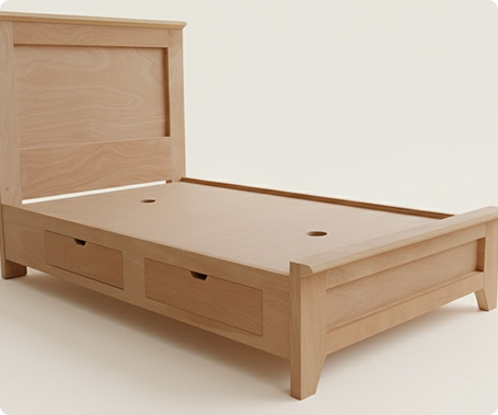 A diferencia de las camas de plataforma baja, esta estructura tiene una altura de cama más convencional, con un cabecero alto de estilo panel que presenta molduras sencillas y un marco bien definido, y un piecero a juego que mantiene la continuidad del diseño. La característica principal de esta cama es su base, que incorpora dos cajones amplios de almacenamiento integrados bajo el colchón, uno al lado del otro en el costado visible, maximizando el espacio útil del dormitorio.