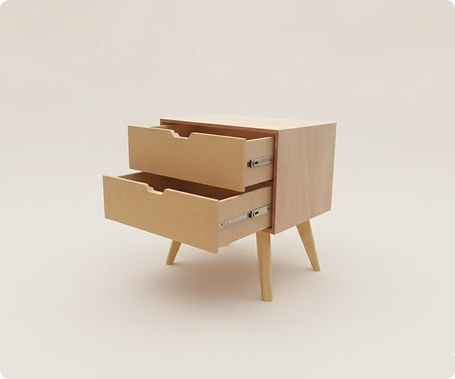 Buró individual de diseño compacto y marcadamente estilo nórdico o Mid-Century Modern , ideal para un dormitorio contemporáneo. Está fabricado en una madera clara con un tono ligeramente melocotón o rosa muy pálido, lo que le confiere una apariencia suave y moderna. La estructura principal es un cubo que alberga dos cajones deslizables del mismo material, que están parcialmente abiertos en la imagen y revelan correderas metálicas para un funcionamiento suave.