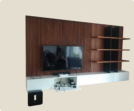 Centro de entretenimiento integral de gran tamaño y diseño moderno, que combina almacenamiento y exhibición en una sola pieza montada en la pared. La estructura se divide en tres elementos principales: una base horizontal blanca de perfil bajo que alberga almacenamiento cerrado con puertas abatibles, visiblemente abierta en el centro para cables y equipos; un panel trasero de pared compuesto por listones de madera verticales de tono cálido, que sirve de fondo para la televisión y el resto del mueble; y un sistema de estante abierto de madera oscura que se extiende desde el panel de listones y ofrece múltiples cubículos para libros o decoración.