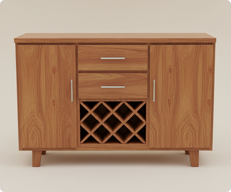 Diseño es simétrico y se enfoca en el almacenamiento multifuncional, combinando secciones cerradas y abiertas: en el centro se encuentra una unidad de dos cajones horizontales apilados, con tiradores alargados y metálicos que aportan un toque contemporáneo. Debajo de los cajones, el mueble incorpora un botellero o cava abierto dividido en múltiples compartimentos cuadrados o romboidales, ideal para organizar.