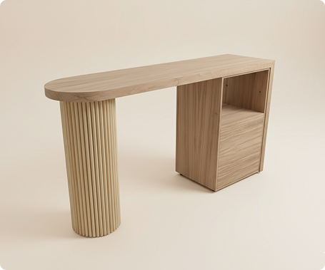 Escritorio o consola de diseño singular y estilo rústico-moderno , fabricado en una madera clara con vetas visibles, probablemente roble o haya, con un acabado natural que le confiere una estética cálida y limpia. Su característica más distintiva es su diseño asimétrico y la combinación de dos soportes muy diferentes: el lado izquierdo se apoya sobre una pata cilíndrica maciza compuesta por múltiples listones de madera verticales y paralelos (un patrón de estrías o ranurado), añadiendo una rica textura visual y un toque artesanal.