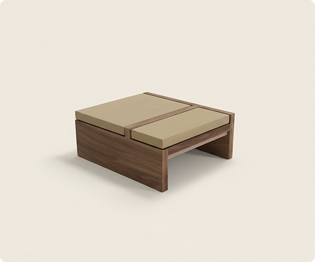 La mesa incorpora una superficie superior segmentada , compuesta por dos paneles deslizables que, al ser retirados o movidos, revelan un espacio interior hueco destinado al almacenamiento de artículos como revistas, mandos o accesorios de sala. Los paneles están diseñados para ajustarse nuevamente al marco, creando una superficie plana y funcional de mesa de centro, lo que convierte la pieza en una solución eficiente que combina una mesa de apoyo con una caja de almacenamiento discreta y elegante.
