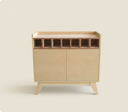 Estructura caracterizada por un espacio superior abierto que incluye una fila de seis compartimentos cuadrados o nichos perfectos para almacenar botellas de vino u otros objetos decorativos, con una pequeña repisa encima. La parte inferior es un módulo cerrado con dos puertas batientes que ocupan casi todo el ancho del mueble, proporcionando un amplio espacio para vajilla o licores.