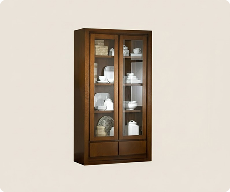 Vitrina alta y estrecha de estilo clásico o tradicional, diseñada para exhibir y almacenar vajilla u objetos decorativos en un comedor o sala. La vitrina está construida en una madera de tono caoba o nogal de color oscuro y cálido, con un acabado pulido.